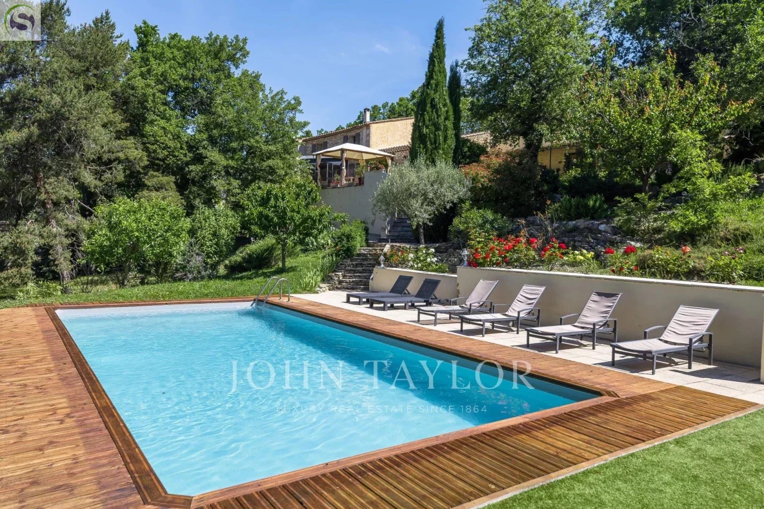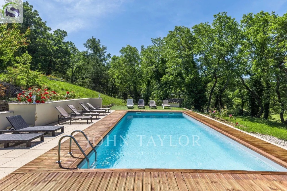Les extérieurs sont soigneusement aménagés avec plusieurs terrasses conviviales, une belle végétation méditerranéenne et une piscine de 10 x 5 m accessible par des escaliers en pierre.