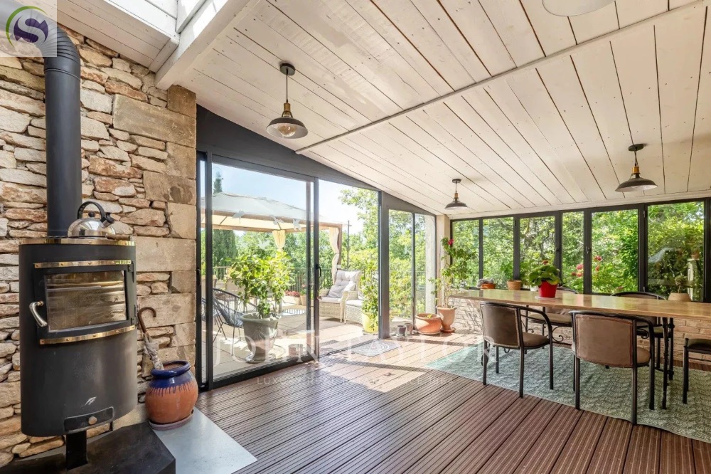 En rez-de-jardin, un vaste salon-séjour d’environ 50 m² avec poêle à granulés et larges ouvertures sur les terrasses exposées sud, une salle à manger avec cuisine ouverte, une véranda lumineuse de 25 m² avec poêle à bois, deux chambres en suite climatisées avec salle d’eau, Wc, terrasse et accès privatif, ainsi qu’une buanderie, des toilettes invités et un cellier.